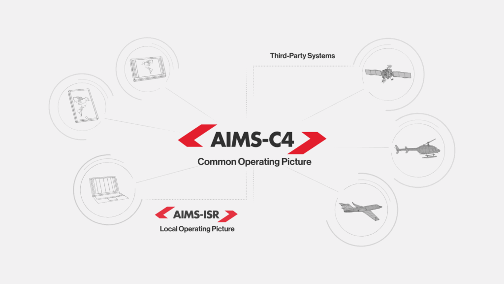 For the common operating picture, there is the AIMS-C4. It is a browser-based application, hosted on a server, and available to anyone with the proper credentials. The system is the nexus for near-real-time data distribution, both to and from AIMS-ISR systems, as well as other third-party systems. With C4, users can share and archive data, review and analyze information, and generate reports.